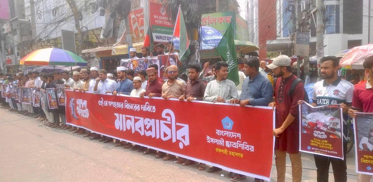 স্টাফ রিপোর্টার: ২০১৩ সালের ৫মে রাজধানীর শাপলা চত্বরে ফ্যাসিস্ট আওয়ামী লীগ সরকারের চালানো গণহত্যার প্রতিবাদে রাজশাহীতে ‘মানবপ্রাচীর কর্মসূচি’ পালন করেছে ইসলামী